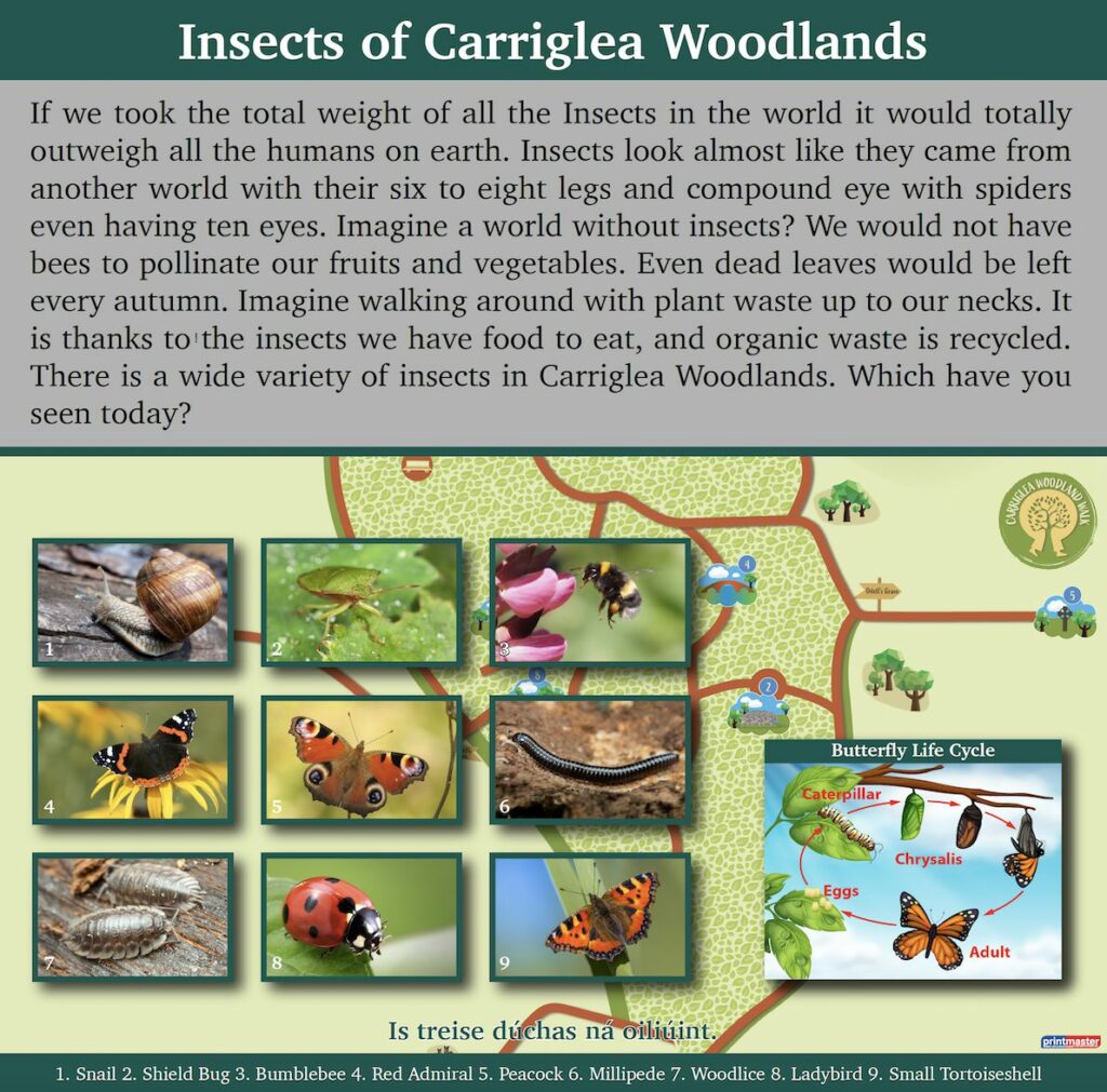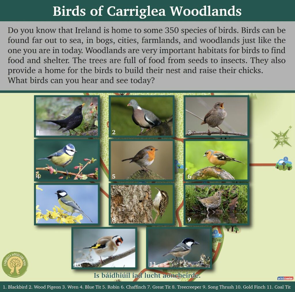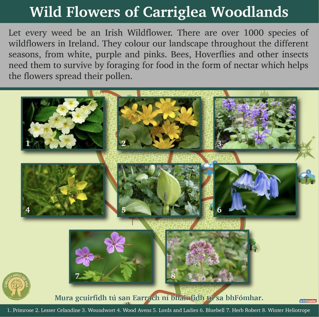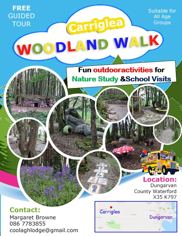Carriglea Woodland Walk welcomes visits from schools and other groups. Suitable for all age groups, and with fun outdoor activities focused on nature study, Carriglea Woodland Walk is perfect for children and adults alike. Group tours must arranged prior to visit. Contact Margaret Browne by telephone on 086 7783855.