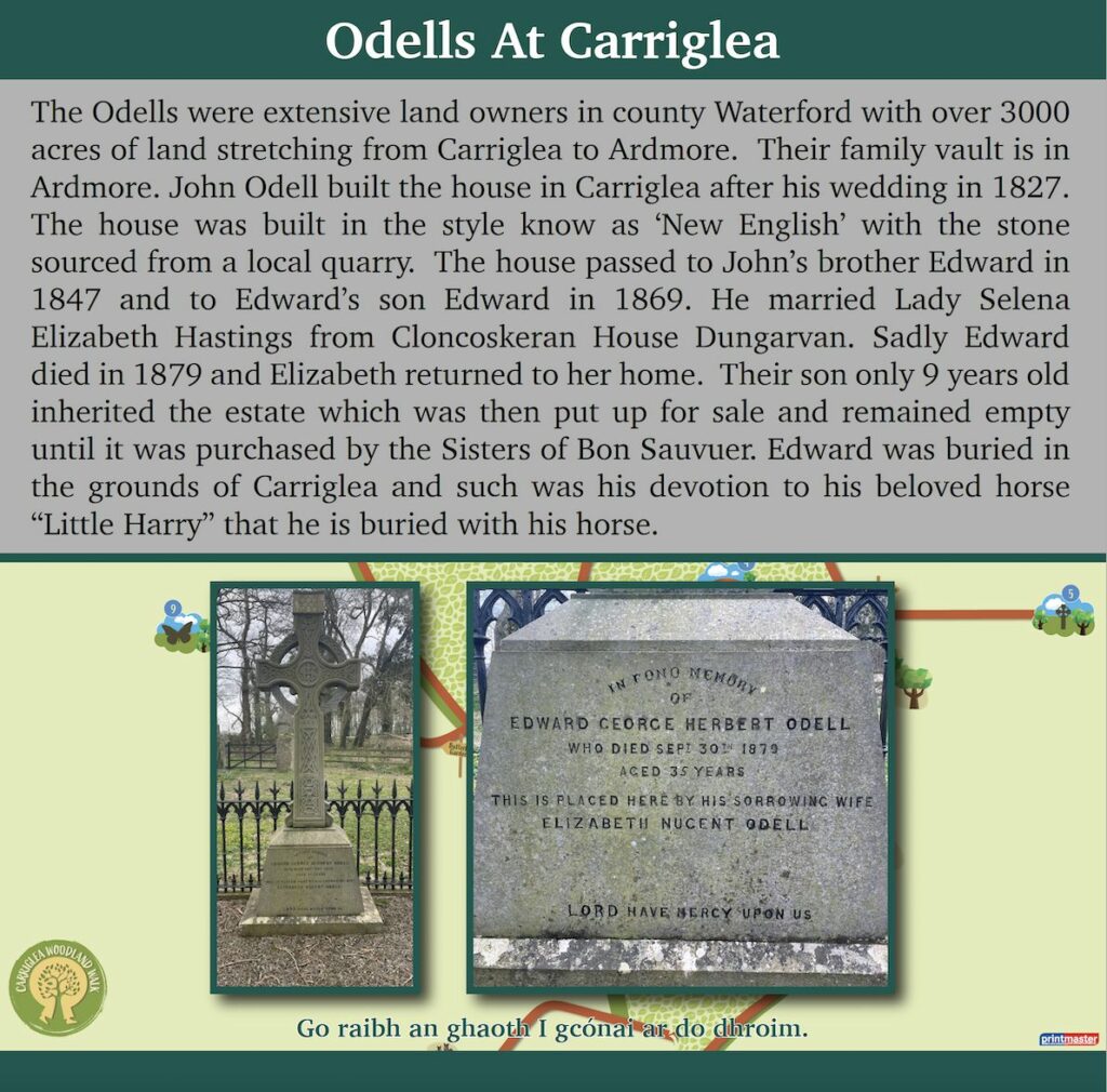 The Odells were extensive land owners in county Waterford with over 3000 acres of land stretching from Carriglea to Ardmore. Their family vault is in Ardmore. John Odell built the house in Carriglea after his wedding in 1827. The house was built in the style know as ‘New English’ with the stone sourced from a local quarry. The house passed to John’s brother Edward in 1847 and to Edward’s son Edward in 1869. He married Lady Selena Elizabeth Hastings from Cloncoskeran House Dungarvan. Sadly Edward died in 1879 and Elizabeth returned to her home. Their son only 9 years old inherited the estate which was then put up for sale and remained empty until it was purchased by the Sisters of Bon Sauvuer. Edward was buried in the grounds of Carriglea and such was his devotion to his beloved horse “Little Harry” that he is buried with his horse.